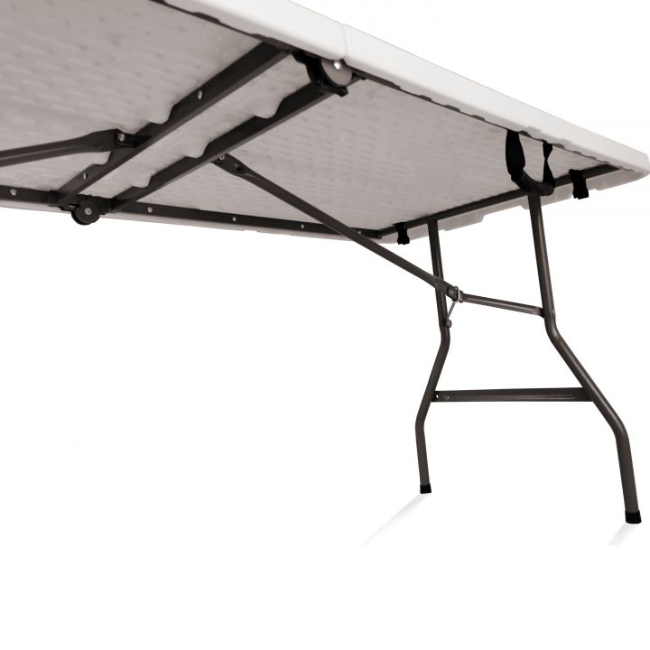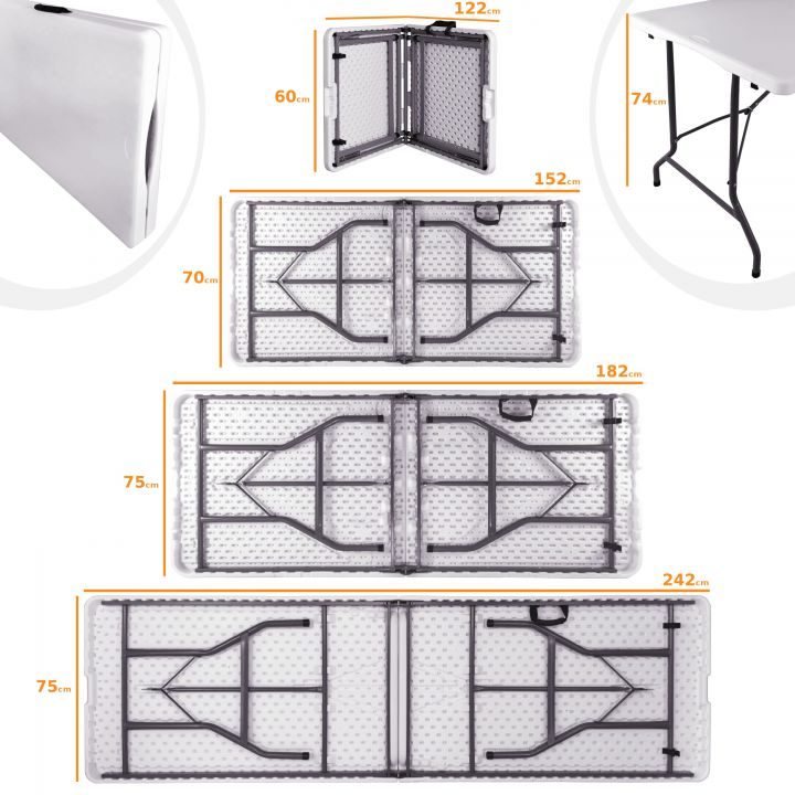 De beste functies zijn onder andere de lichte, poedergecoate constructie van de poten en het gepatenteerde vergrendelmechanisme dat de opgevouwen poten plat houdt wanneer ze niet worden gebruikt. Het tafelblad is gemaakt van HDPE-laminaat, een kras- en vlekbestendig oppervlak. Opklapbare tafels hebben veelzijdige toepassingen. We vinden ze vaak op feesten en banketten georganiseerd door cateringbedrijven, maar ze worden ook veel gebruikt in huizen en tuinen.