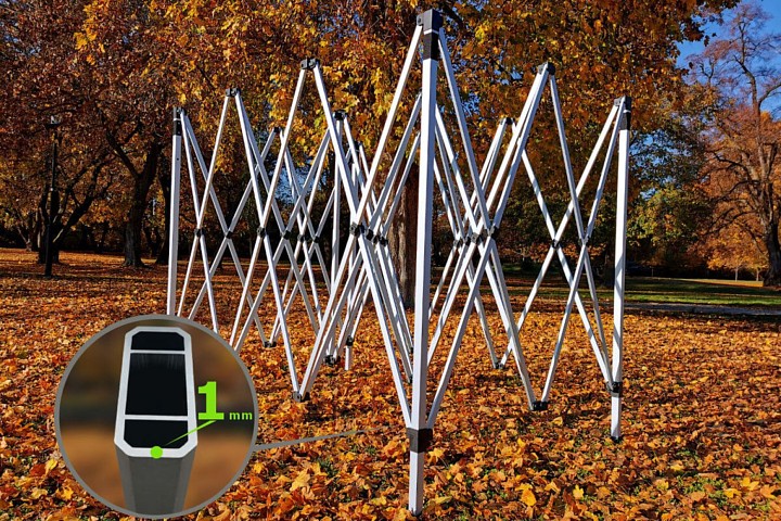 Het meest gebruikte materiaal is aluminium. Het heeft ongelooflijk goede eigenschappen, is licht van gewicht, maar heeft een grote sterkte en zekerheid. Het lage gewicht zal je waarderen als je vaak verkoopt onder de tent en deze moet verplaatsen. De tent wordt in enkele seconden opgezet en ingeklapt.