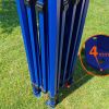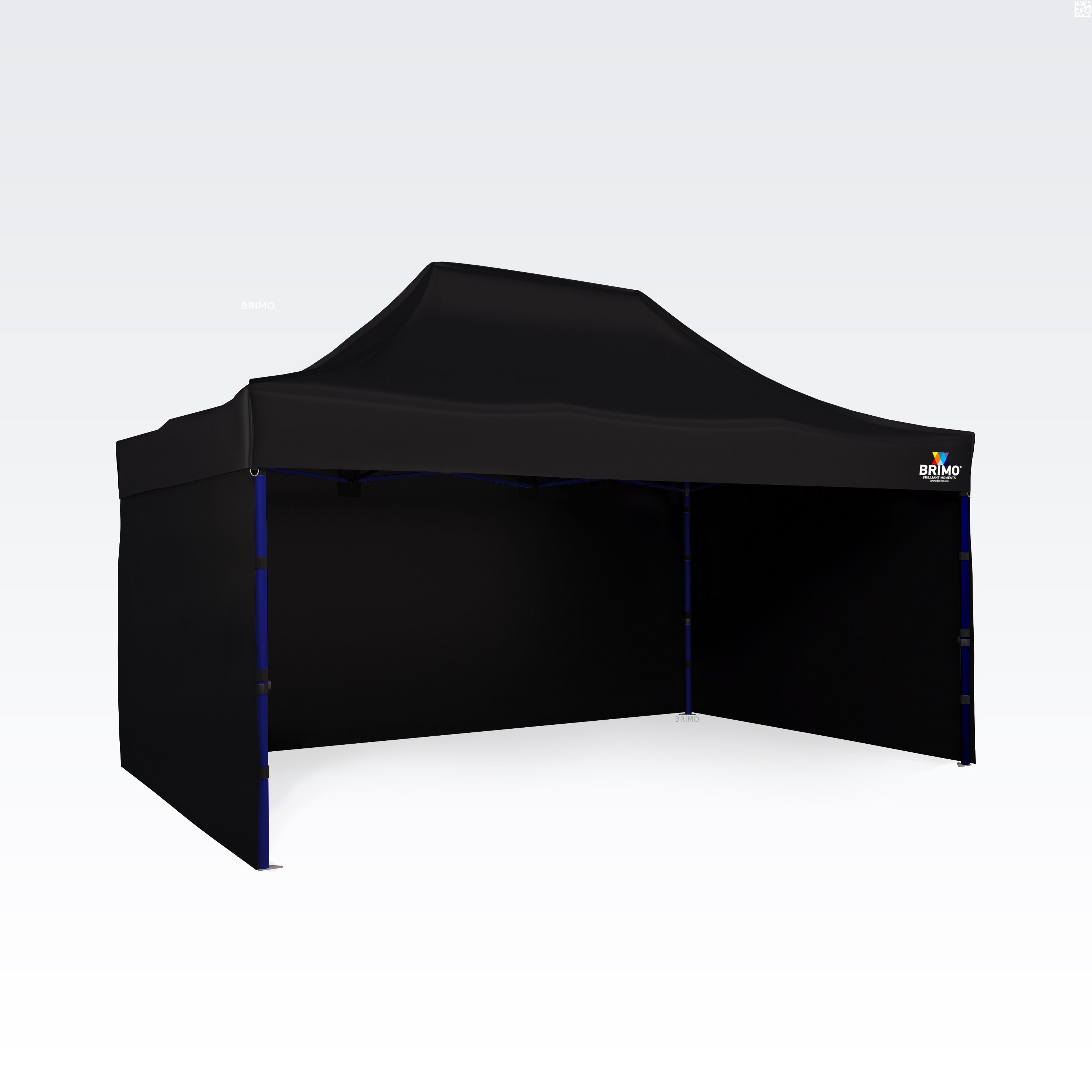 De donkerblauwe, koninklijke kleur van het frame is uniek en onderscheidend. De kleur van de zeilen kan naar wens worden gecombineerd en afgestemd op de omgeving. Heb je een eigen idee voor het ontwerp van de tent? Geen probleem. Wij maken een beurs tent pop-up volgens jouw wensen met de door jou aangeleverde grafiek.