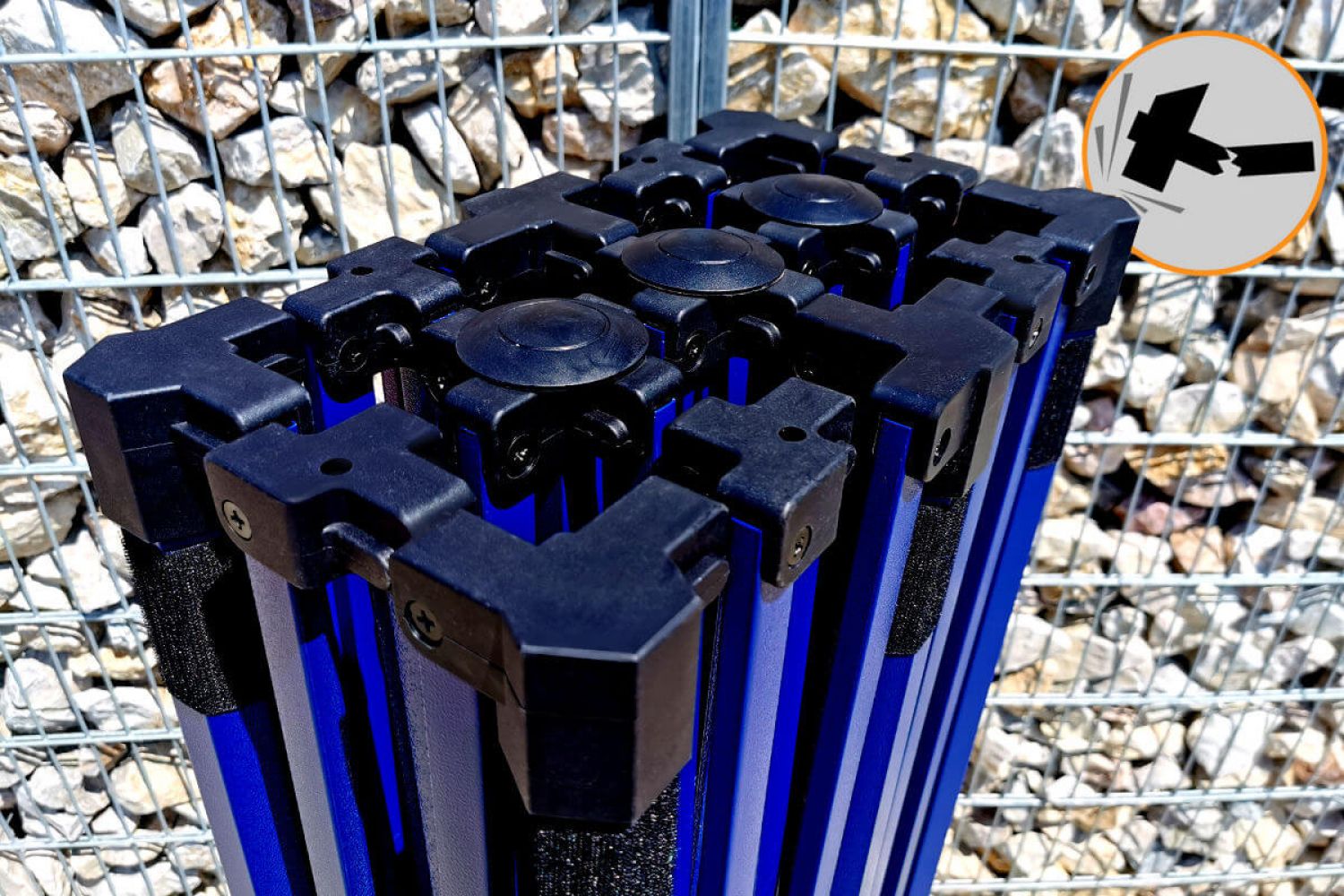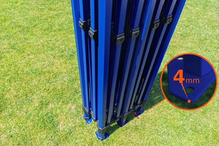 De kleur van het frame is koningsblauw. Deze kleur geeft de hele tent een exclusieve uitstraling. Hij onderscheidt zich van de concurrentie, is iets nieuws op de markt – iets wat iedereen wil hebben. Wij geloven dat elke ondernemer wil opvallen in de massa, daarom hebben wij deze exclusieve tent met een onconventionele framekleur aan ons aanbod toegevoegd.