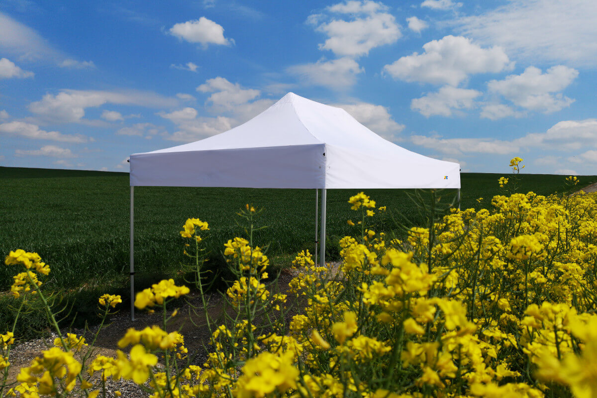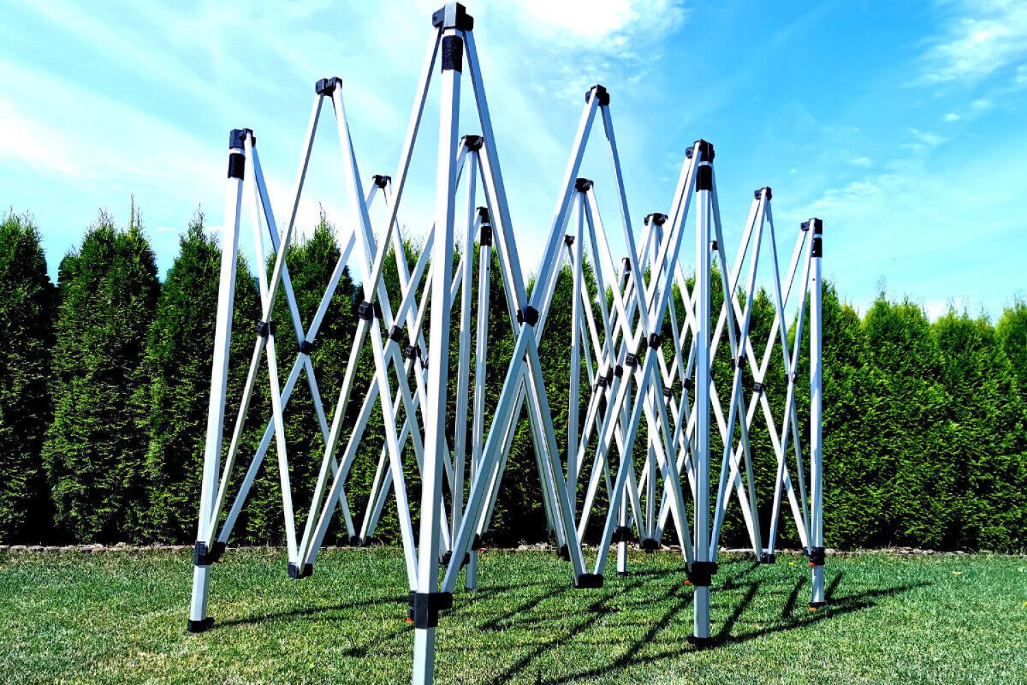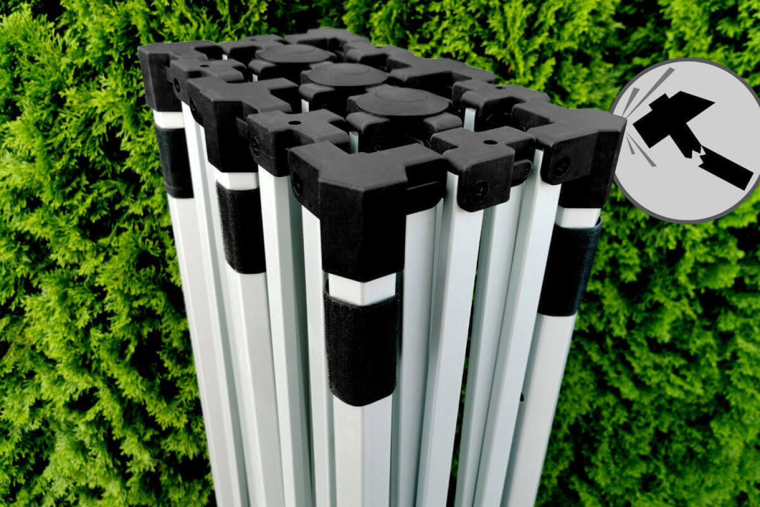 Dankzij het snelvouwwerkmechanisme kunt u in minder dan een minuut een royale overdekte ruimte creëren voor uw goederen en klanten, volledig zonder gereedschap. De basis voor de stabiliteit van deze mobiele tent is een robuust aluminium profiel met een hexagonale (zeskantige) doorsnede. Dikke voetplaten aan de onderkant van de poten zorgen voor een betrouwbare verankering in het terrein, terwijl hoogwaardige schroefverbindingen een soepele hantering garanderen en eventueel onderhoud vergemakkelijken.