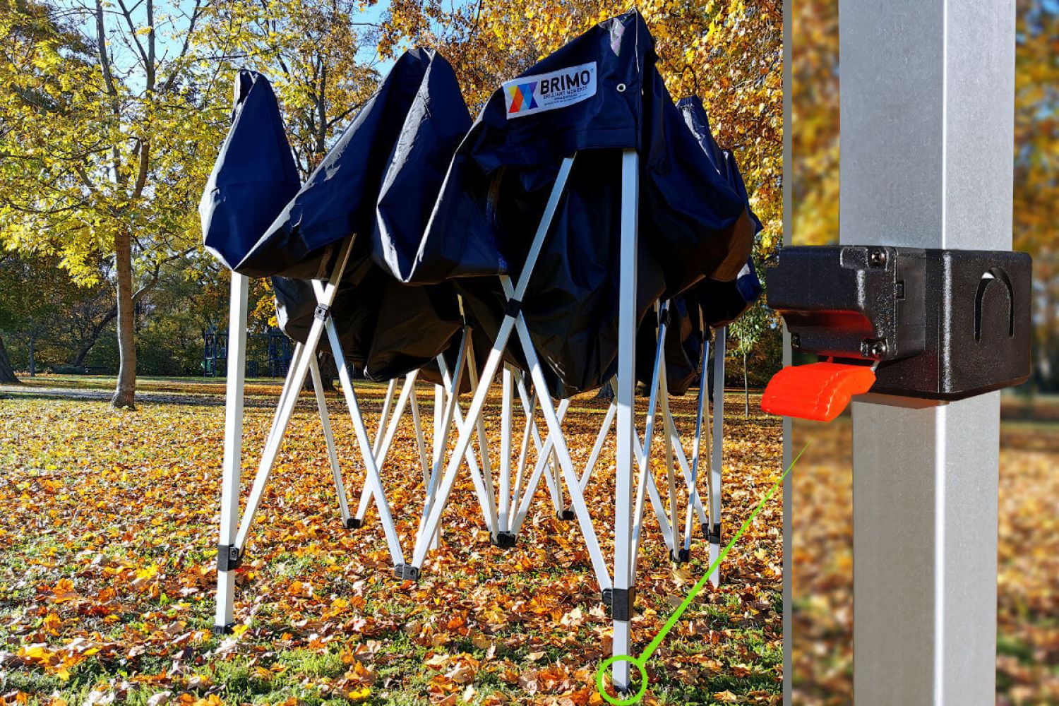 De pop-up reclametent kan zowel buiten als binnen worden gebruikt. Negeer het beveiligen van de tent niet. De tent moet altijd worden beveiligd, ongeacht het weer. Het pakket bevat haringen voor verankering. Als je de tent op een harde ondergrond plaatst, kunnen stalen gewichten of zandzakken worden gebruikt voor verankering. Voor extra verankering gebruiken klanten ook touwen met haringen, die ook als accessoires voor de tent kunnen worden besteld.