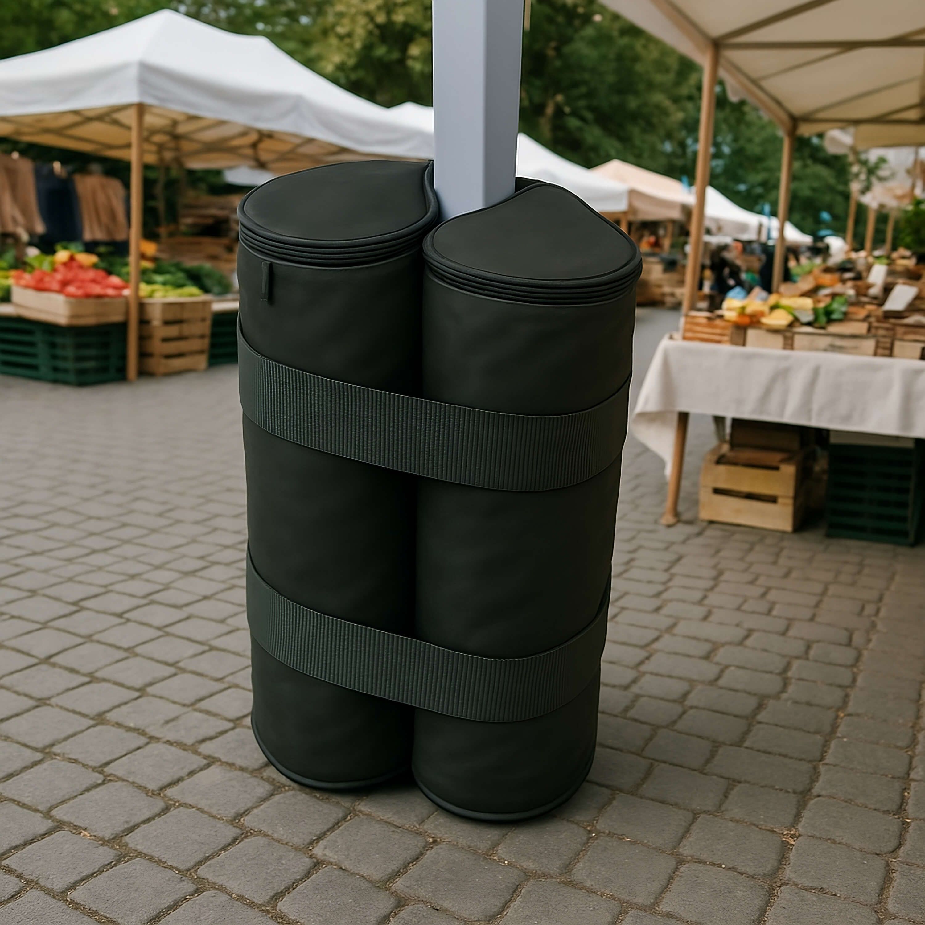 Zandzakken zijn een praktische oplossing voor het verzwaren van de tent op een harde ondergrond. De zakken zijn dubbel, gevuld met zand of grind. Het gewicht na het vullen is 14 kg. Ze worden verkocht in sets van 4 en 6 stuks. De stof is schokbestendig. De binnenkant van de zakken is gecoat, zodat het zand niet uit de zakken valt.