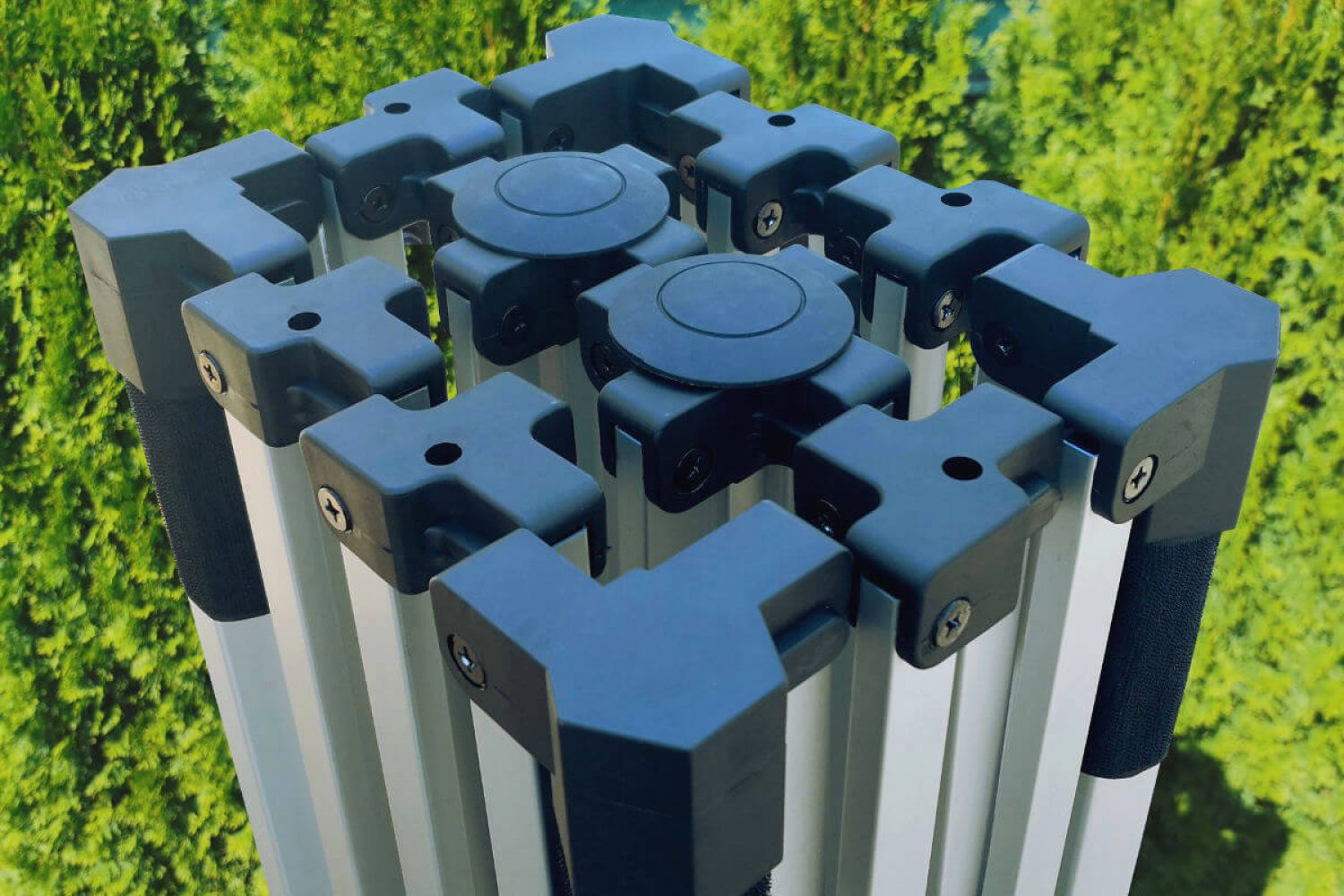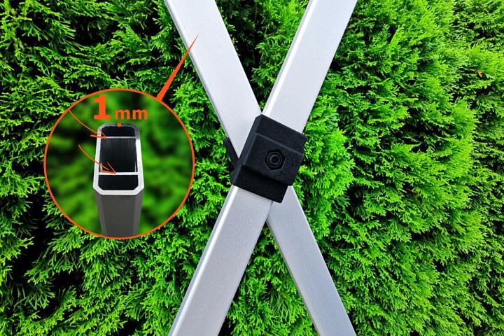 Vergeet ingewikkelde montage-instructies. Geschroefde verbindingen en het schaarmechanisme maken het mogelijk de tent binnen een minuut op te zetten zonder gereedschap. Alle componenten zijn gemaakt van duurzame polymeren die bestand zijn tegen stoten. De aluminium buizen hebben versterkte wanden en een hexagonaal (zeshoekig) profiel, wat ze een aanzienlijk hogere stabiliteit geeft vergeleken met goedkope vierkante profielen. Hoewel aluminium licht is, gebruiken we in onze tenten meer materiaal om een sterkte te bereiken die vergelijkbaar is met zware staalconstructies.